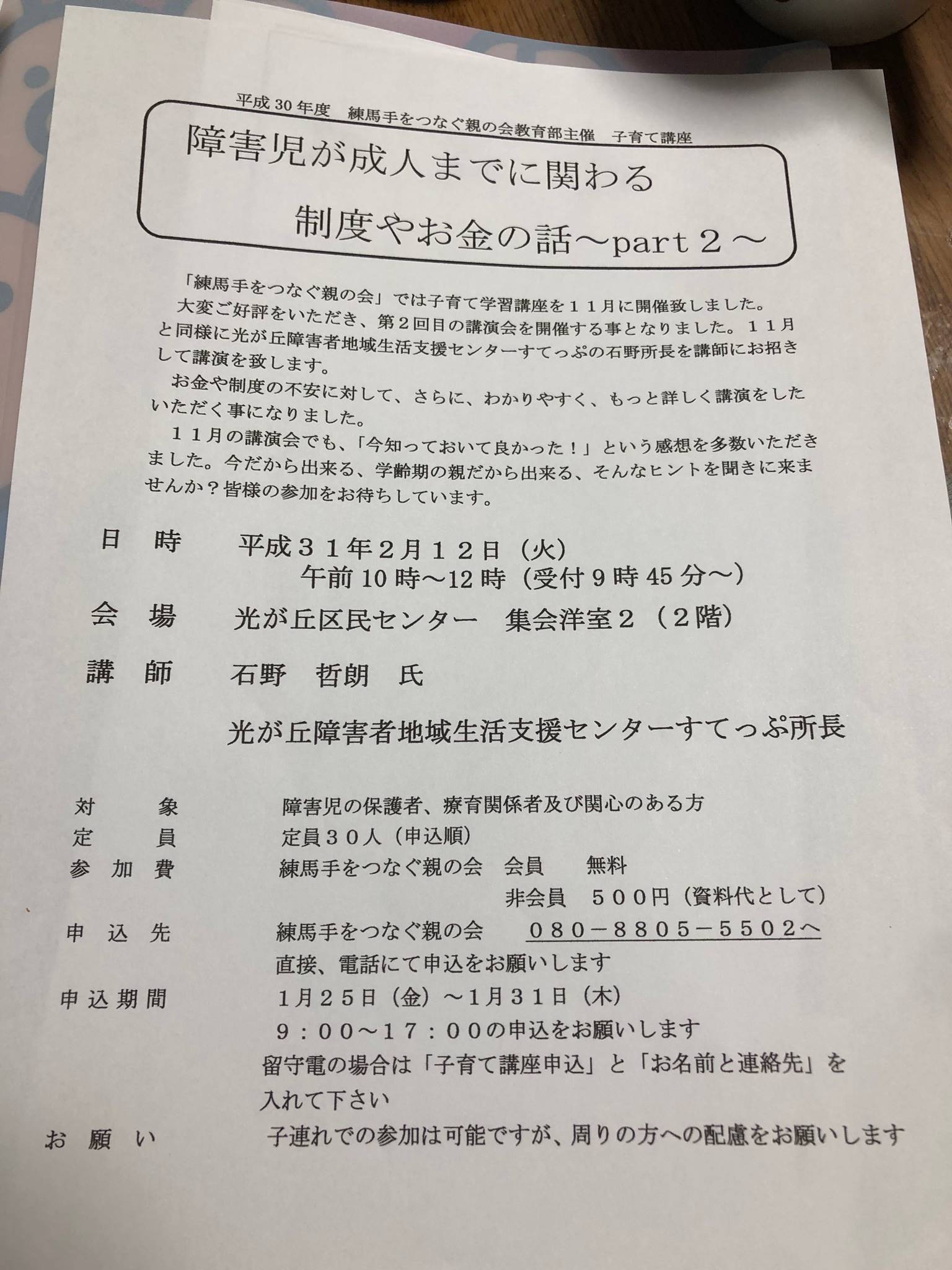 『障害児が成人までに考える、お金の準備と将来計画についてを中心に話します。前回は幅広く概要をお話したけれど、アンケートを踏まえて絞った話となると思います。』という事です。前回に聞いた方も、2回目も是非にです!