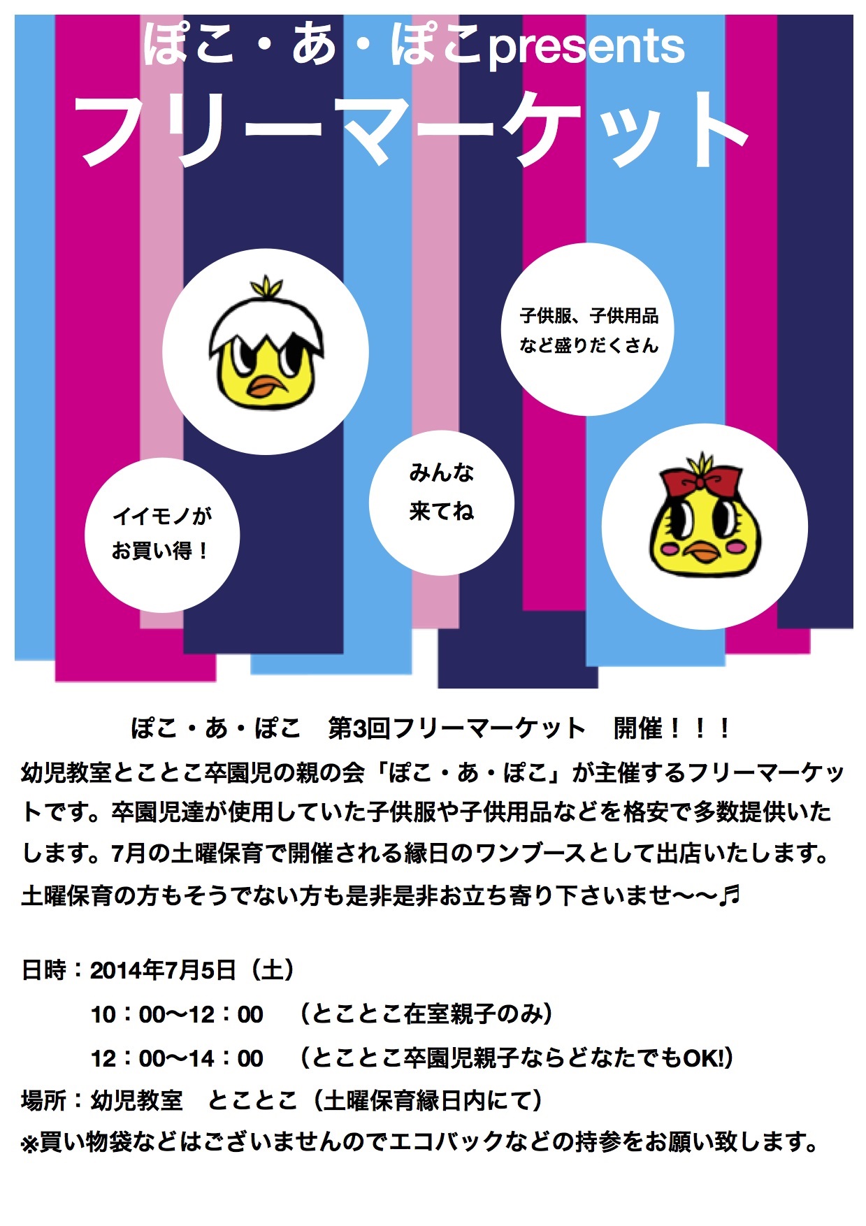 7月5日(土)に開催する、ぽこ・あ・ぽこフリーマーケットの